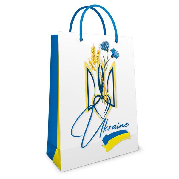 Пакет подарунковий з малюнком Тризуб з волошками. Картон щільністю 250 г/м², повнокольоровий друк, глянсове ламінування, люверси, ручки – шнур із наконечниками-фіксаторами. Розмір 24х34х8,8 см