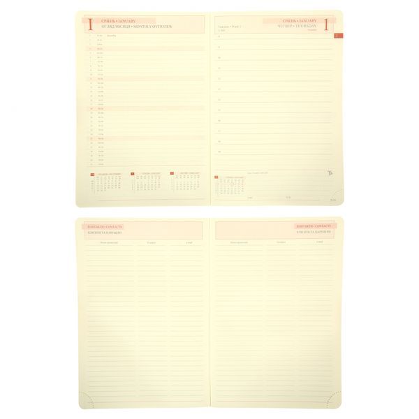 Щоденник Leo Planner City – ваш надійний помічник для детального щоденного планування, фіксації ідей та ефективної організації особистих і робочих справ. Оптимальний формат А5 зручний для щоденних записів, легко поміщається в сумку, залишаючи простір для ідей і планів. Наявність двох лясе додає зручність при пошуку потрібної сторінки та дозволяє швидко орієнтуватися у записах. Функціональне рішення для тих, хто веде паралельні плани чи використовує щоденник для кількох напрямків. Тверда обкладинка забезпечує надійний захист вмісту та стійкість до щоденного використання. Ідеальний варіант для тих, хто цінує міцність, стабільність та практичність. Якісний та зносостійкий PU-матеріал обкладинки забезпечить довготривалий презентабельний вигляд ділового записника, захистить від вологи та пилу. Обкладинка приємна на дотик, легко очищується і надає щоденнику стильного вигляду. Спеціально розроблений декоративний шов на обкладинці підкреслює дизайн та створює відчуття стилю й уваги до деталей. Резинка для ручки надійно фіксує та утримує пишучий інструмент на обкладинці, не додаючи зайвого об’єму. Стильне й функціональне рішення для щоденного користування. Можливість персоналізації у вигляді сліпого тиснення або тиснення фольгою – ефектне рішення для створення унікального стилю на ваш вибір. Паперовий блок продуманий до дрібниць для комфортного щоденного користування. Він налічує 368 сторінок, що забезпечує достатньо простору для щоденних записів, планів і нотаток. Папір щільністю 80 г/м² дозволяє комфортно писати ручкою чи олівцем без просвічування. Кремовий папір не втомлює очі навіть за тривалої роботи. Закруглені кути паперового блока не лише додають стильного вигляду, а й запобігають швидкому зношенню сторінок. Це практичне рішення для збереження ділового записника охайним у щоденному користуванні. Перфоровані кути паперового блока дозволяють легко маркувати актуальну сторінку. Це зручний функціональний елемент, що допомагає швидко орієнтуватися у записах та тримати планування під контролем. Фольгований паперовий зріз надає елегантного блиску та преміального вигляду, що підкреслює ваш статус та вишуканий стиль вашого планера. Характеристики: - Тип: датований - Формат / розмір: A5 - Тип обкладинки: тверда - Матеріал обкладинки: PU - Закладки: 2 закладки-ляссе - Можливість персоналізації: сліпе тиснення або тиснення фольгою на обкладинці Характеристики внутрішнього блоку: - Кремовий офсет, 80 г/м² 368 сторінок - Колір паперового зрізу: фольгований - Відривний перфорований куток - 2 мапи України та Європи - Календарі та довідково-інформаційний блок із корисними даними - Додаткові сторінки для та нотаток
