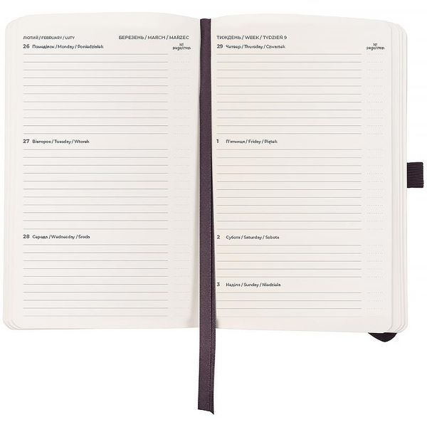 Щотижневик Axent формату А5- із серії Soft Skin в м’якій обкладинці із текстурою під шкіру. Використовується для щоденних записів, а також ділових та творчих задач. М`яка обкладинка допомагає зберегти акуратний зовнішній вигляд протягом довгого часу. Якісний кремовий папір щільністю 80 г/м2 добре вбирає чорнило та забезпечує комфортне письмо. Зручно робити записи, креслити та малювати. Щотижневик поділений на 2 частини – датований блок у лінію для зручного планування справ і додаткові сторінки у клітинку для ведення особистих записів. Дві різнокольорові закладки-ляссе дозволяють швидко знайти та відкрити потрібні сторінки. Кишеня на форзаці надійно зберігає нотатки, чеки, картки та інші важливі дрібниці. Еластична тасьма запобігає самовільному відкриванню. Містить 96 аркушів, розмір - 125*195 мм.