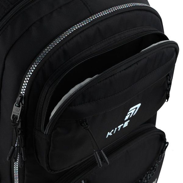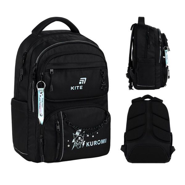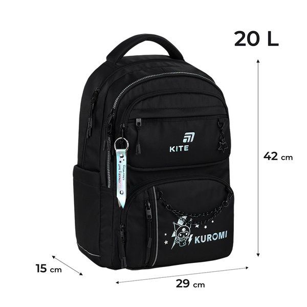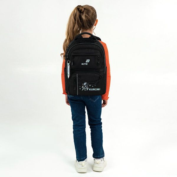 Рюкзак шкільний Kite HK26-2594M – це модель для активних і сучасних дітей, які цінують естетику, зручність і свободу руху. Він створений для динамічного темпу життя: надійно сидить на плечах і дозволяє швидко знаходити потрібні речі навіть під час найактивнішого дня. Форма рюкзака чітка, структурована та максимально функціональна. Модель виглядає сучасно та відповідає трендам урбаністичного стилю: лаконічний силует, плавні лінії, акцент на деталях. Цей рюкзак легко впізнати в натовпі. Він не просто доповнює шкільний образ – він робить його особливим. Модель рекомендована для школярів зростом від 130 – 145 см. Рюкзак із Kurоmi сподобається підліткам, які люблять стильні образи та хочуть виділятися. Смілива бешкетниця Куромі символізує свободу бути собою щодня. Бренд Kite – визнаний лідер у світі рюкзаків, який щороку отримує найпрестижніші нагороди: Вибір року, Вибір країни, Українська народна премія. Споживачі та експерти ринку обирають Kite за бездоганну якість, стиль, інноваційні рішення та ергономічний дизайн. Рюкзак зовні: анатомічна спинка – комфорт під час носіння; широкі S-подібні лямки – зниження навантаження на плечі; чотири передні кишені – швидкий доступ до потрібних речей; дві бічні кишені – зручно для пляшечки чи невеличкого термоса; прихована кишеня на спинці – безпечне зберігання цінних дрібниць; світловідбивні елементи – безпека у темний час доби; м'яка ущільнена ручка та ручка-петля – комфортне носіння в руці або зберігання на гачку; знімний нагрудний ремінь – надійна фіксація рюкзака під час руху; ущільнене дно – додаткова стійкість; надійна фурнітура – тривале комфортне користування; декор: тканина – гладенький твіл; об'ємний голографічний друк; блискавка з зубцями з голографічним покриттям; карабін у формі зірки; металеві ланцюжки на карабінах; брелок-підвіска з голографічного PVC матеріалу з друком на металевому карабіні. Рюкзак всередині: два відділення – оптимальна організація простору; роздільники з фіксуючою резинкою – порядок для зошитів і книжок; кишеня для планшета – дбайливе зберігання гаджетів кишеня для телефона з плюшевою підкладкою – делікатний захист екрану; органайзер – акуратність для дрібних речей; знімна ключниця – ключі завжди під контролем; брендована підкладка – міцна та практична.