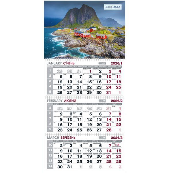 Календарь BUROMAX 2026 год - незаменимая вещь, которая поможет Вам легко спланировать свой месяц, квартал и год. Удобный настенный квартальный календарь на 3-х пружинах. Три блока, на каждом блоке один месяц, по 12 листов в каждом блоке Размер изделия: 298х648мм Размер постера: 298х210мм, изготовлен из целлюлозного картона 300 г/м². Размер блоков: 298х140мм, изготовлены из мелованной бумаги 90 г/м² Календарная сетка на двух языках: украинском, английском Комплектуется указателем даты и отверстием для крепления Дополнительная информация: церковные, государственные и профессиональные праздники, выходные дни