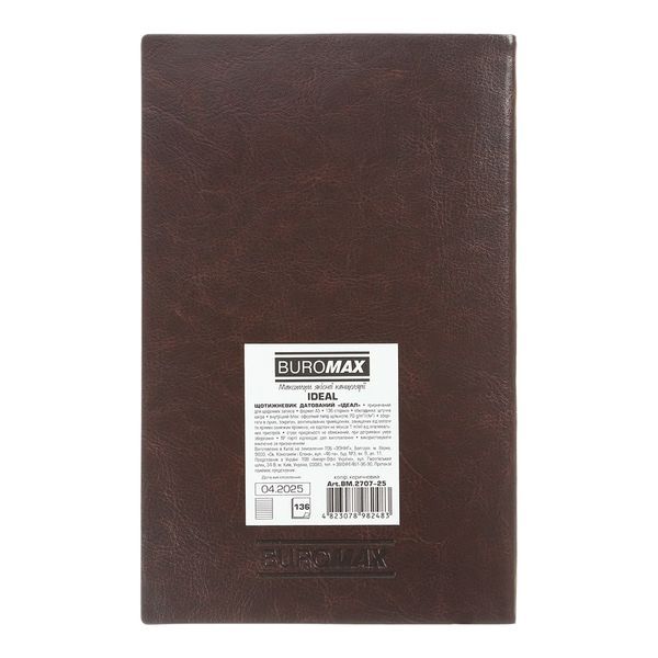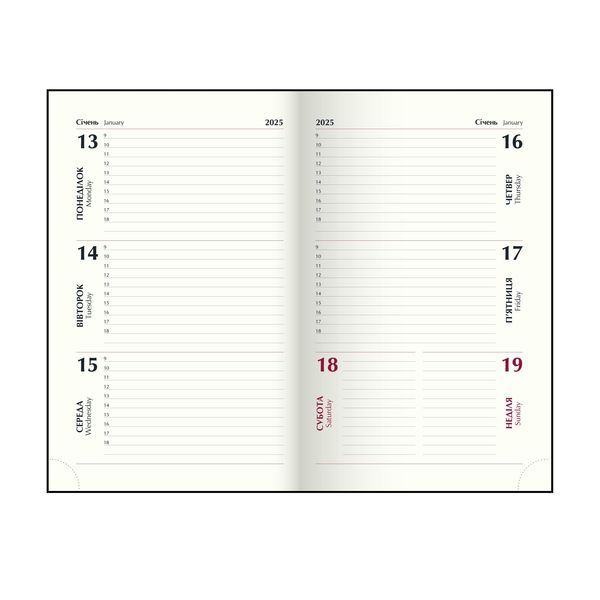 Гибкая обложка еженедельника IDEAL выполнена из искусственной кожи с фактурой натуральной кожи. Гармонично дополняет дизайн тиснение года на лицевой стороне обложки и тонированный срез внутреннего блока в цвет обложки. Формат А5 136 страниц Внутренний блок: офсетная бумага кремового цвета плотностью 70 г/м² Закладка-ляссе в цвет обложки Перфорированные уголки листов Печать блока в 2 цвета: серый и бордовый Два языка блока: украинский, английский Карты Украины и Европы на форзацах Индивидуальная упаковка: картонная коробка Структура внутреннего блока: Страница для внесения личной информации Календари на 2025 – 2028 годы Планинг на 2026 год Информационно-справочный блок: национальные, религиозные, профессиональные праздники и памятные даты, знаки зодиака, телефонные коды мобильных операторов и областных центров Украины, буквенные автомобильные коды стран, таблица расстояний между областными центрами Украины, справочник систем измерения, международные знаки соответствия, знаки ухода за одеждой На одной странице горизонтально размещено три/четыре дня недели (суббота и воскресенье - вертикальное расположение на одной части), с организатором времени с 9:00 до 18:00, указанием месяца, года, дня недели и даты Алфавитная книга для внесения контактов Еженедельник BUROMAX – незаменимый помощник в планировании Вашего рабочего времени! На данном виде еженедельника возможно тиснение как слепым методом, так и методом фольгирования. .