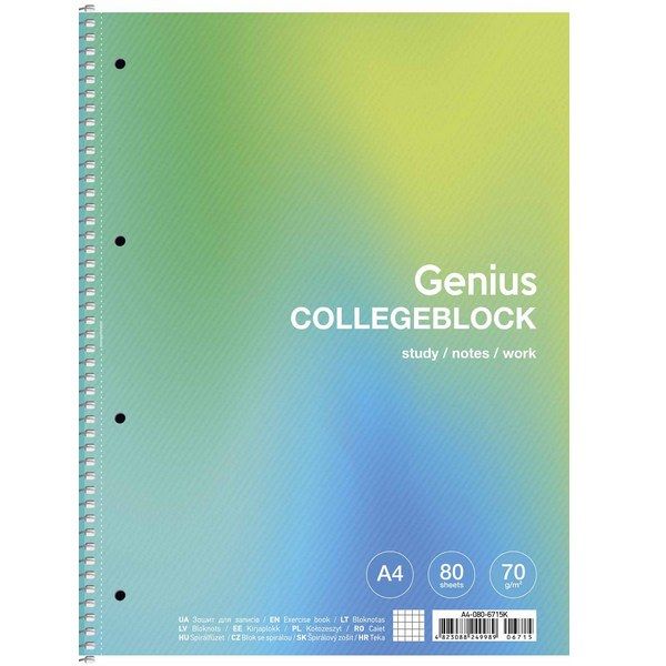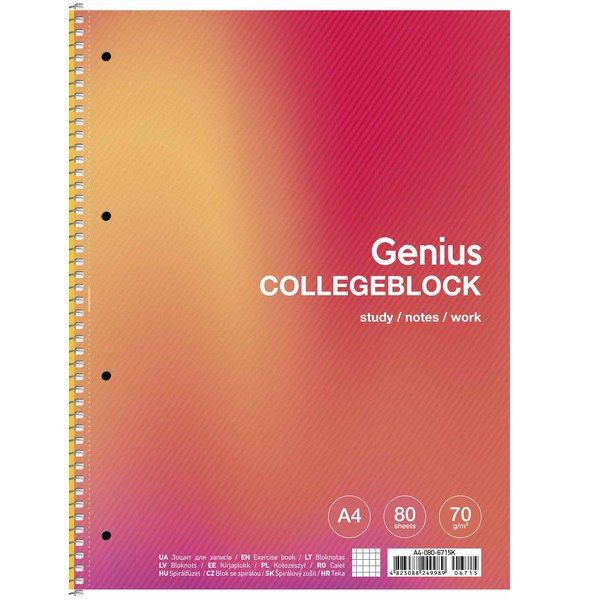 Коледж-блок формат А4, Кріплення: спіраль Кількість аркушів: 80, кремовий колір Обкладинка: м'яка картонна щільність 210гр Дизайн: асорті 2 види Внутрішній блок: клітинка Папір білий, 70гр щільність Мікроперфорація, отвори для папки-реєстратора