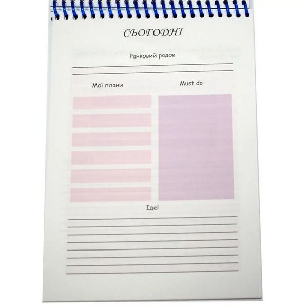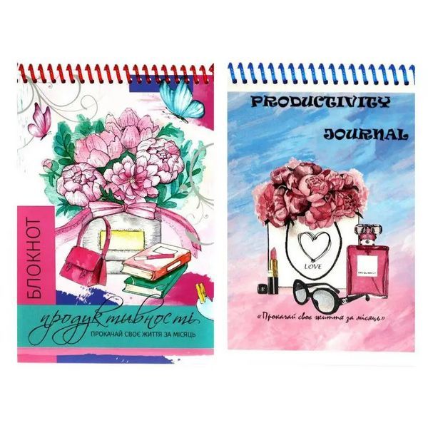 Формат А5, 80 арк. Обкладинка - кольорова, целюлозний картон, УФ-лак Блок - повнокольоровий, офсет 80 г/м², палітурка- пружина зверху 2 види, мікс