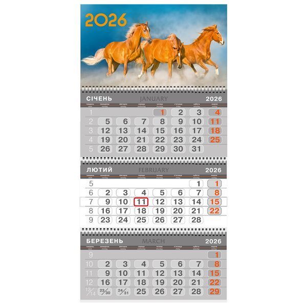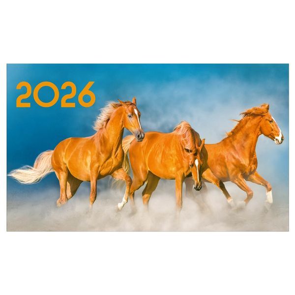 Календар настінний перекидний квартальний 3 пружини 36х68,5см Коні 2026 Поліграфіст