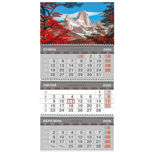 Календар настінний перекидний квартальний 3 пружини 36х68,5см Скелі 2026 Поліграфіст