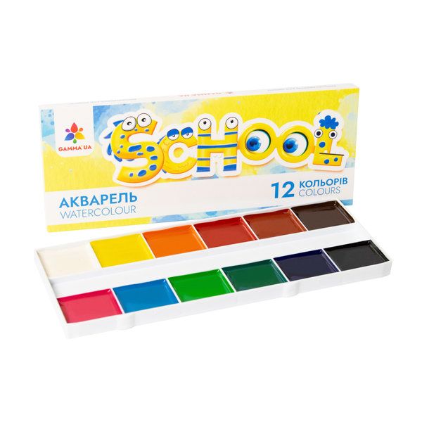 Основні характеристики: - чисті кольори та широка гама тонів: від легких і ніжних до насичених і яскравих; - кольори легко змішуються між собою, утворюючи нові відтінки; - прозора акварель, що не дає осаду, добре розноситься на папері та швидко висихає; - надійна та висока якість фарб; - пластикова основа з фарбами упакована в якісний картонний футляр; - без пензля; - 12 кольорів; - зроблено в Україні