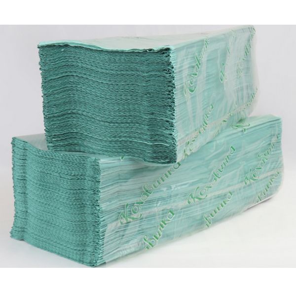 Рушник паперовий макулатурний зелений 1 шар V-складання 170 шт/уп Кохавинка. Розмір листа 23х25 см. Рушник виготовлено з макулатури. Використовується готелями, закладами громадського харчування та ін. Паперовим рушником можна протирати гладкі поверхні, зручно витирати пролиту рідину або мокрі руки. Кількість в ящику 25 уп.