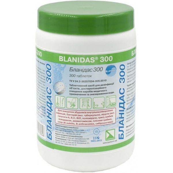 Таблетки для дезінфекції Бланідас 300 широкого спектру дії на основі хлору. Має вигляд сухої таблетки, яка розчиняється в воді. Дезінфекція та миття поверхонь приміщень (підлога, стіни, двері, підвіконня, віконні рами та т.д.). Дезінфекція та дестірілізація виробів медичного призначення. Для знезараження перед утилізацією використаних виробів медичного призначення. Дезінфекція та дестерілізація перукарського, манікюрного, педікюрного, косметичного інструментарію. Дезінфекція води в плавальних басейнах. В банці 300 таблеток. Склад: Натрієва сіль дихлоризоциануровой кислоти - 80,52%, Адипінова кислота - 8.66%, Бікарбонат натрію - 8.66%, Карбонат натрію - 2.16%..