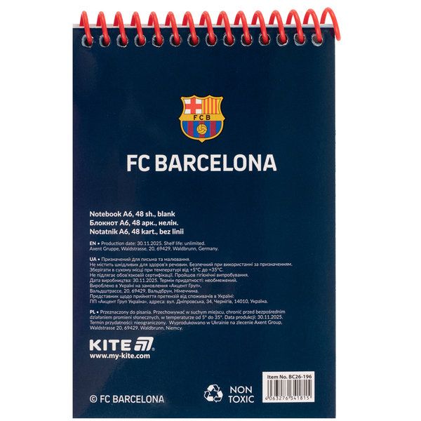 Блокнот Kite BC26-196 – яскравий дитячий блокнотик у зручному форматі. Він з нетерпінням чекає, коли дітлахи наповнять його чисті сторінки своїми неповторними записами та малюнками. У блокноті так приємно зберігати думки, робити нотатки та ескізи. Ефектна строката обкладинка та кольорові нелінійовані листи піднімають настрій та надихають на творчість. Завдяки кріпленню на пластиковій спіралі, можна акуратно вирвати будь-який аркуш, не пошкодивши блокнот або розкрити його на цілих 360°. Кишеньковий формат – компактний, його можна завжди носити із собою у сумочці, рюкзаку або просто в кишені. Зберіть повну колекцію канцелярії Kite у крутій ліцензії FC Barcelona, щоб улюблені персонажі завжди були поруч. Особливості: 48 кольорових щільних нелінійованих аркушів – для записів та творчості; компактний формат А6- (97х150 мм) – щоб усюди брати його із собою; кріплення на пластиковій спіралі – зручно відкривати під будь-яким кутом; обкладинка із щільного картону – практична та міцна; ліцензія FC Barcelona – для натхнення.