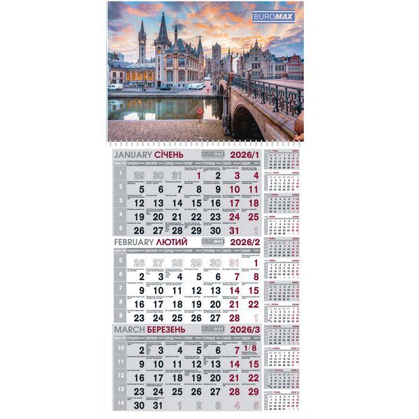 Календар BUROMAX на 2026 рік – незамінна річ, яка допоможе Вам легко спланувати свій місяць, квартал і рік. Зручний настінний квартальний календар на одній білій пружині 12 відривних аркушів з крейдованого паперу щільністю 90 г/м² розміром 298х420 мм На кожному аркуші три місяці детально: поточний, попередній та наступний та невеликий календар на рік Розмір виробу: 297х630 мм Розмір постера: 297х210 мм, виготовлений з целюлозного картону 300 г/м² Календарна сітка на двох мовах: українською, англійською Комплектується вказівником дати і отвором для кріплення Додаткова інформація: церковні, державні та професійні свята, вихідні дні