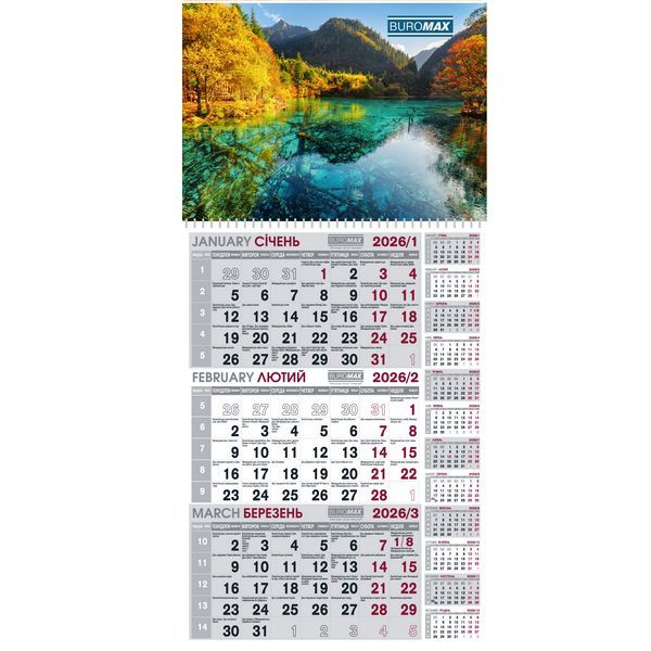 Календар BUROMAX на 2026 рік – незамінна річ, яка допоможе Вам легко спланувати свій місяць, квартал і рік. Зручний настінний квартальний календар на одній білій пружині 12 відривних аркушів з крейдованого паперу щільністю 90 г/м² розміром 298х420 мм На кожному аркуші три місяці детально: поточний, попередній та наступний та невеликий календар на рік Розмір виробу: 297х630 мм Розмір постера: 297х210 мм, виготовлений з целюлозного картону 300 г/м² Календарна сітка на двох мовах: українською, англійською Комплектується вказівником дати і отвором для кріплення Додаткова інформація: церковні, державні та професійні свята, вихідні дні
