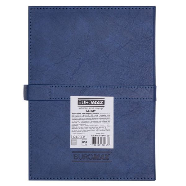 Жорстка обкладинка зі штучної шкіри з поролоном щоденника LEROY виконана з вишуканого фактурного матеріалу, має елегантне тиснення фольгою на лицьовій стороні та магнітну металеву застібку-хлястик, яка зафіксує щоденник в закритому положенні. Гармонійно доповнює дизайн тонований в колір обкладинки зріз внутрішнього блоку. Формат А5 336 сторінок Внутрішній блок: офсетний папір кремового кольору щільністю 70 г/м² Закладка-лясе в колір обкладинки Перфоровані куточки аркушів Друк блоку в 2 кольори: сірий і бордовий Дві мови блоку: українська, англійська Мапи України та Європи на форзацах Індивідуальна упаковка: картонна коробка Структура внутрішнього блоку: Сторінка для внесення особистої інформації Календарі на 2025 - 2028 роки Планінг на 2026 рік Інформаційно-довідковий блок: національні, релігійні, професійні свята та пам'ятні дати, знаки зодіаку, телефонні коди мобільних операторів та обласних центрів України, літерні автомобільні коди країн, таблиця відстаней між обласними центрами України, довідник систем вимірювання, міжнародні знаки відповідності, знаки догляду за одягом Датована сторінка на кожен день року з організатором часу від 7:00 до 21:00, календарем на поточний/наступний місяць, позначенням дня тижня, знаку зодіаку, іменинників Алфавітна книга для внесення контактів Щоденник BUROMAX формату А5 - це вибір, перевірений часом, найпопулярніший формат для незамінного помічника в плануванні Вашого робочого дня! На цій моделі щоденника можливе тиснення як сліпим методом так і методом фольгування.