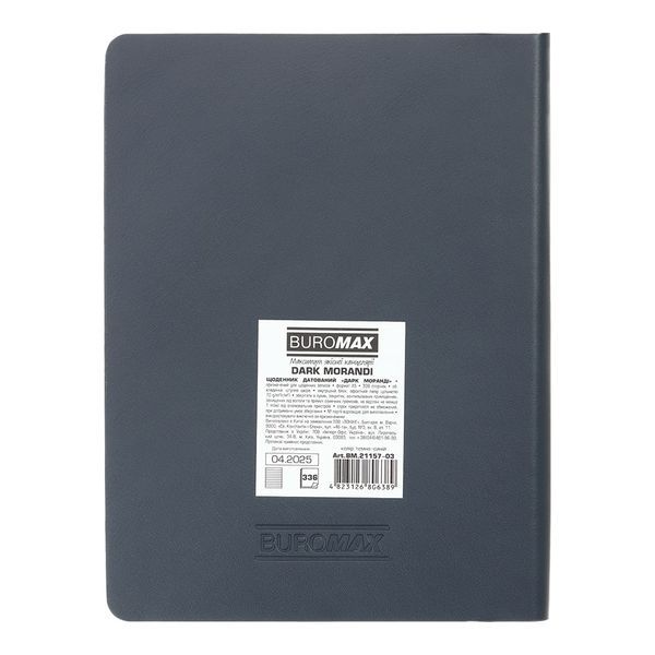 Гнучка обкладинка зі штучної шкіри щоденника DARK MORANDI виконана з приємного на дотик матеріалу в насиченому кольорі модної палітри "моранді" та має оригінальне сліпе тиснення року на лицьовій стороні. Гармонійно доповнює дизайн тонований в колір обладинки зріз внутрішнього блоку. Формат А5 336 сторінок Внутрішній блок: офсетний папір кремового кольору щільністю 70 г/м² Закладка-лясе в колір обкладинки Перфоровані куточки аркушів Друк блоку в 2 кольори: сірий і бордовий Дві мови блоку: українська, англійська Форзаци в колір обкладинки Індивідуальна упаковка: картонна коробка Структура внутрішнього блоку: Сторінка для внесення особистої інформації Календарі на 2025 - 2028 роки Планінг на 2026 рік Інформаційно-довідковий блок: національні, релігійні, професійні свята та пам'ятні дати, знаки зодіаку, телефонні коди мобільних операторів та обласних центрів України, літерні автомобільні коди країн, таблиця відстаней між обласними центрами України, довідник систем вимірювання, міжнародні знаки відповідності, знаки догляду за одягом Датована сторінка на кожен день року з організатором часу від 7:00 до 21:00, календарем на поточний/наступний місяць, позначенням дня тижня, знаку зодіаку, іменинників Алфавітна книга для внесення контактів Щоденник BUROMAX формату А5 - це вибір, перевірений часом, найпопулярніший формат для незамінного помічника в плануванні Вашого робочого дня! На цій моделі щоденника можливе тиснення як сліпим методом так і методом фольгування.
