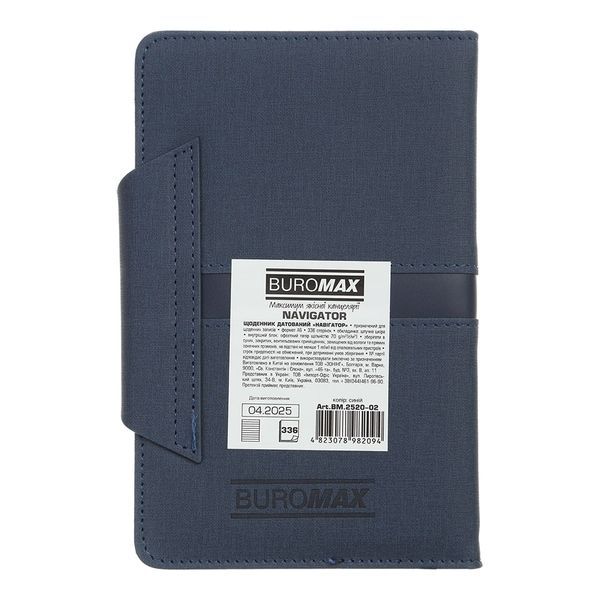 Жорстка обкладинка щоденника NAVIGATOR виконана зі штучної шкіри з поролоном. Завдяки широкій магнітній застібці, щоденник можна легко та швидко зафіксувати в закритому стані. Оригінальності щоденнику додає комбінація фактур та кольорів штучної шкіри на обкладинці, а також оформлення декоративними швами по периметру обкладинки та на стику матеріалів. Елегантний дизайн гармонійно доповнює тонований зріз в колір обкладинки і сліпе тиснення року на застібці. Формат А6 336 сторінок Внутрішній блок: офсетний папір кремового кольору щільністю 70 г/м² Закладка-лясе в колір обкладинки Перфоровані куточки аркушів Друк блоку в 2 кольори: сірий і бордовий Дві мови блоку: українська, англійська Мапи України та Європи на форзацах Індивідуальна упаковка: картонна коробка Структура внутрішнього блоку: Сторінка для внесення особистої інформації Календарі на 2025 - 2028 роки Планінг на 2026 рік Інформаційно-довідковий блок: національні, релігійні, професійні свята та пам'ятні дати, знаки зодіаку, телефонні коди мобільних операторів та обласних центрів України, літерні автомобільні коди країн, таблиця відстаней між обласними центрами України, довідник систем вимірювання, міжнародні знаки відповідності, знаки догляду за одягом Датована сторінка на кожен день року з організатором часу від 7:00 до 21:00, календарем на поточний/наступний місяць, позначенням дня тижня, знаку зодіаку, іменинників Алфавітна книга для внесення контактів Щоденник BUROMAX - незамінний помічник в плануванні Вашого робочого дня, перевірений часом! На цій моделі щоденника рекомендується тиснення сліпим методом та методом фольгування.