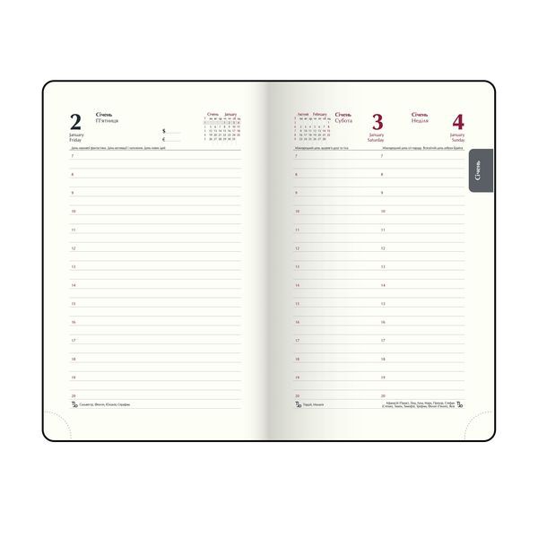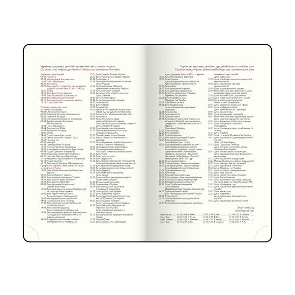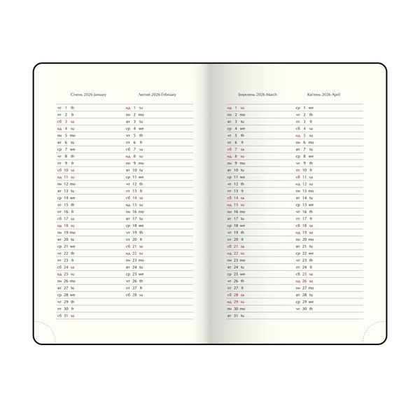 Жорстка обкладинка щоденника BRAVO виготовлена з гладкої штучної шкіри, з поролоном у класичному дизайні. На лицьовій стороні - тиснення року сліпим методом. Тонування зрізу золотом додає вишуканий акцент. Формат А6 336 сторінок Внутрішній блок: офсетний папір кремового кольору щільністю 70 г/м² Закладка-лясе в колір обкладинки Перфоровані куточки аркушів Друк блоку в 2 кольори: сірий і бордовий Дві мови блоку: українська, англійська Мапи України та Європи на форзацах Індивідуальна упаковка: картонна коробка Структура внутрішнього блоку: Сторінка для внесення особистої інформації Календарі на 2025 - 2028 роки Планінг на 2026 рік Інформаційно-довідковий блок: національні, релігійні, професійні свята та пам'ятні дати, знаки зодіаку, телефонні коди мобільних операторів та обласних центрів України, літерні автомобільні коди країн, таблиця відстаней між обласними центрами України, довідник систем вимірювання, міжнародні знаки відповідності, знаки догляду за одягом Датована сторінка на кожен день року з організатором часу від 7:00 до 21:00, календарем на поточний/наступний місяць, позначенням дня тижня, знаку зодіаку, іменинників Алфавітна книга для внесення контактів