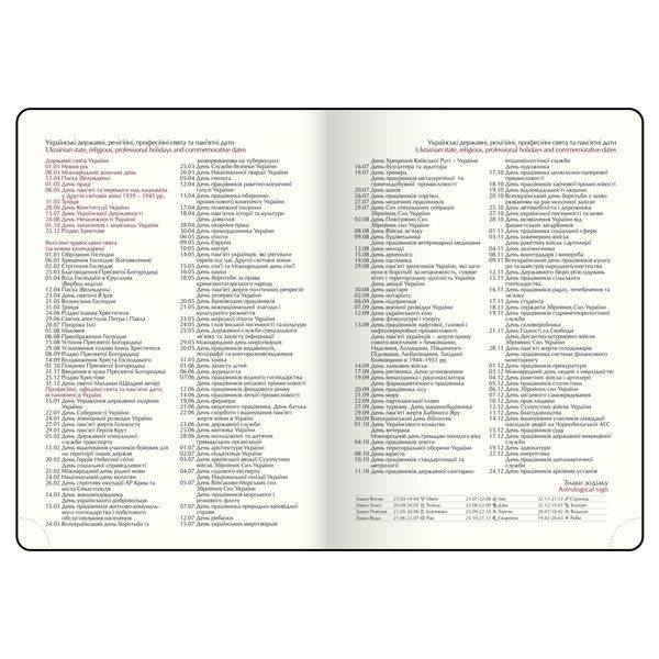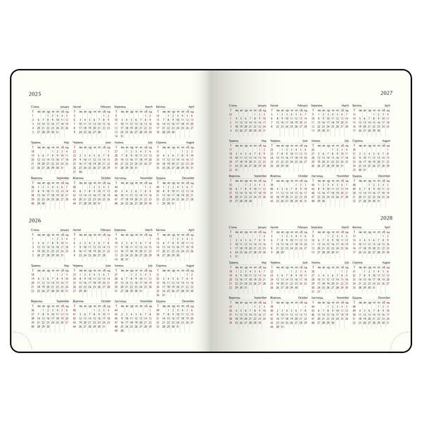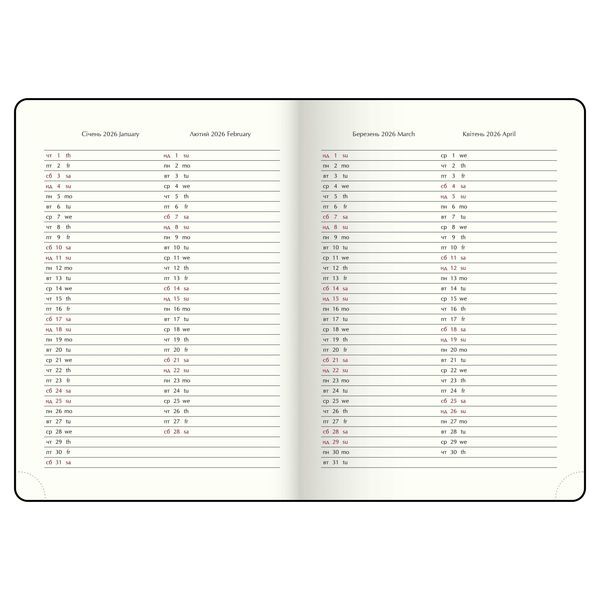 Тверда обкладинка щоденника BRAVO виготовлена з гладкої штучної шкіри, з поролоном. На лицьовій стороні - тиснення року сліпим методом. Тонування зрізу золотом додає вишуканий акцент. Класичний та стриманий дизайн стане відмінним доповненням корпоративного стилю компанії. Великий формат щоденника дозволяє не тільки планувати, але й робити змістовні нотатки та записи. Формат А4 336 сторінок Внутрішній блок: офсетний папір кремового кольору щільністю 70 г/м² Закладка-лясе в колір обкладинки допоможе швидко знайти необхідну сторінку Перфоровані куточки Друк блоку в 2 кольори: сірий і бордовий Дві мови блоку: українська, англійська Мапи України та Європи на форзацах Індивідуальна упаковка: картонна коробка Структура внутрішнього блоку: Аркуш для внесення особистої інформації Календарі на 2025 - 2028 роки Планінг на 2026 рік Інформаційно-довідковий блок: національні, релігійні, професійні свята та пам'ятні дати, знаки зодіаку, телефонні коди мобільних операторів та обласних центрів України, літерні автомобільні коди країн, таблиця відстаней між обласними центрами України, довідник систем вимірювання, міжнародні знаки відповідності, знаки догляду за одягом Датована сторінка на кожен день року з організатором часу від 7:00 до 21:00, календарем на поточний/наступний місяць, позначенням дня тижня, знаку зодіаку, іменинників Субота і неділя - вертикальне розташування на одній сторінці Алфавітна книга для внесення контактів Щоденник BUROMAX - незамінний помічник в плануванні Вашого робочого дня, перевірений часом! На цій моделі щоденника можливе тиснення сліпим методом і методом фольгування.