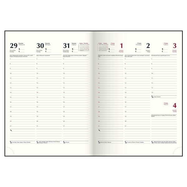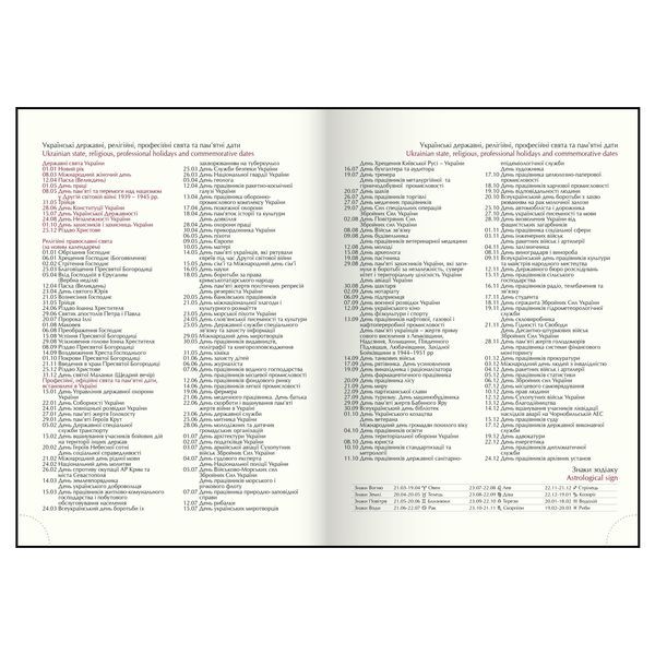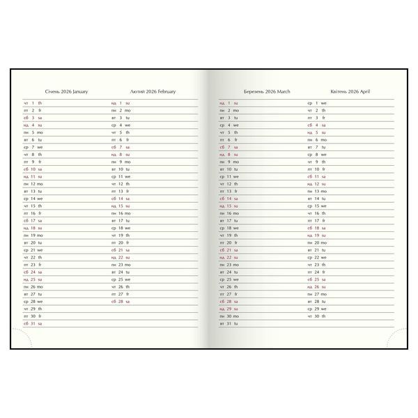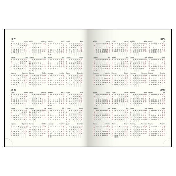 Жорстка обкладинка зі штучної шкіри щотижневика ORION водночас оригінальна та лаконічна. Фактура обкладинки імітує фактуру натуральної шкіри. Гармонійно доповнює дизайн обкладинки сліпе тиснення року на лицьовій стороні та декоративний шов по периметру та поперек обкладинки. Великий формат дозволяє не тільки планувати, але й робити змістовні нотатки та записи. Формат А4 136 сторінок Внутрішній блок: офсетний папір кремового кольору щільністю 70 г/м² Закладка-лясе в колір обкладинки Перфоровані куточки аркушів Друк блоку в 2 кольори: сірий і бордовий Дві мови блоку: українська, англійська Мапи України та Європи на форзацах Індивідуальна упаковка: картонна коробка Структура внутрішнього блоку: Сторінка для внесення особистої інформації Календарі на 2025 - 2028 роки Планінг на 2026 рік Інформаційно-довідковий блок: національні, релігійні, професійні свята та пам'ятні дати, знаки зодіаку, телефонні коди мобільних операторів та обласних центрів України, літерні автомобільні коди країн, таблиця відстаней між обласними центрами України, довідник систем вимірювання, міжнародні знаки відповідності, знаки догляду за одягом На одній сторінці вертикально розміщено три/чотири дні тижня (субота і неділя - вертикальне розташування на одній частині), з організатором часу від 7:00 до 21:00, вказівкою місяця, року, дня тижня та дати, календар на поточний/наступний місяць, іменинники, знаки зодіаку, свята та пам'ятні дати Алфавітна книга для внесення контактів Щотижневик BUROMAX - незамінний помічник в плануванні Вашого робочого часу! На цій моделі щотижневика можливо тиснення сліпим методом та методом фольгування.