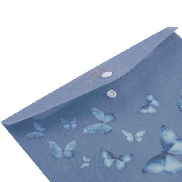 Основні характеристики: - для паперів формату А5 (розмір 180х240 мм); - матеріал: матовий напівпрозорий пластик товщиною 180 мкм; - закривається клапаном за допомогою пластикової кнопки, що забезпечує надійне збереження паперів та легкий доступ до них; - місткість до 150 аркушів; - основний колір: синій електрик