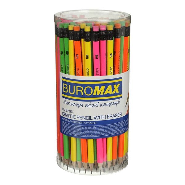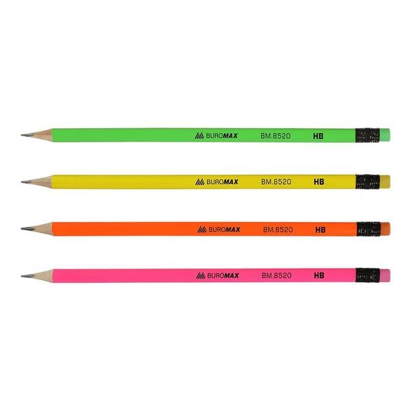 Олівець графітний Buromax НВ неон з гумкою - твердість HB; - з кольоровою гумкою в тон корпусу; - шестигранний корпус; - довжина корпусу 190 мм; - діаметр грифелю 2,2 мм; - матеріал корпусу - натуральне дерево; - дизайн корпусу: корпус виконаний в неонових кольорах (салатовий, жовтий, рожевий, помаранчевий) з глянцевим покриттям, срібним тисненням та чорною обоймою; - заточений; - легко заточується, не кришиться та не ламається в процесі письма, малювання, креслення та заточення; - упаковка: пластикова туба по 100 шт.