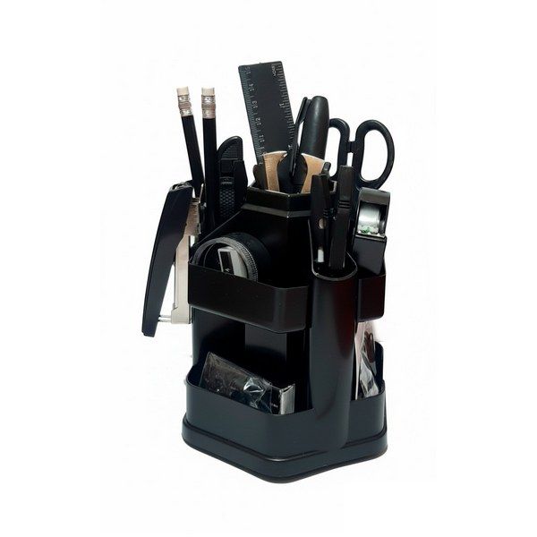 Набір настільний з наповненням на 17 предметів. Конструкція з обертовою пластиковою підставкою (360⁰), яка має 10 відділень. До набору входить: підставка, 2 ручки, 2 олівця чорногр., ножиці, степлер, скоби, антистеплер, ніж канцелярський, лінійка, точилка, ластик, скріпки, кнопки-гвіздки, папір для нотаток, диспенсер для скотча. Матеріал: пластик. Колір: чорний. Розмір: 146х148мм.
