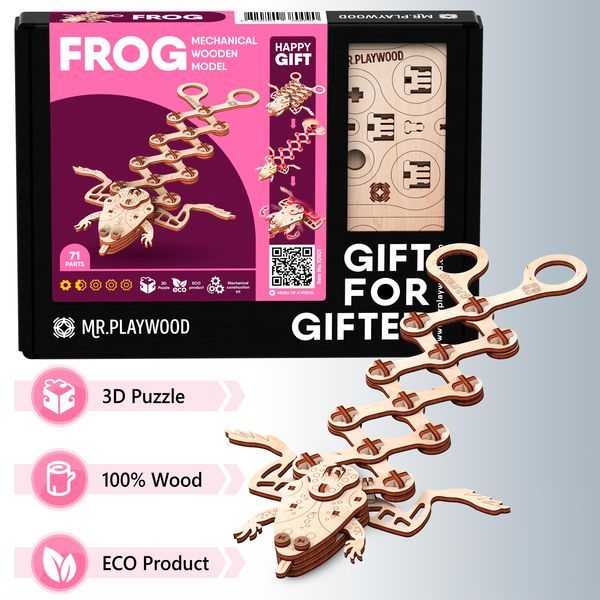 Жабка від Mr.Playwood вистрибне з рук, якщо стиснути “ножиці” пружини. З нею можна грати в веселу гру – «квача», щоб наздоганяючи інших торкатися їх лапками дерев’яної жабки. Конструктор збирається з деталей, які необхідно від’єднати від планшетів і зібрати по інструкції Кількість деталей 71 деталей Для дітей від 14 років. Розмір моделі в зібраному виді, мм 195(410)*200*30 Розмір упаковки см 24*18*3