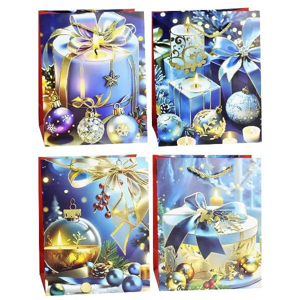 Пакет подарочный бумажный 18х23х10см. Плотность 210 г/м2. Ручки - шнурок. В одной упаковке 4 дизайна.