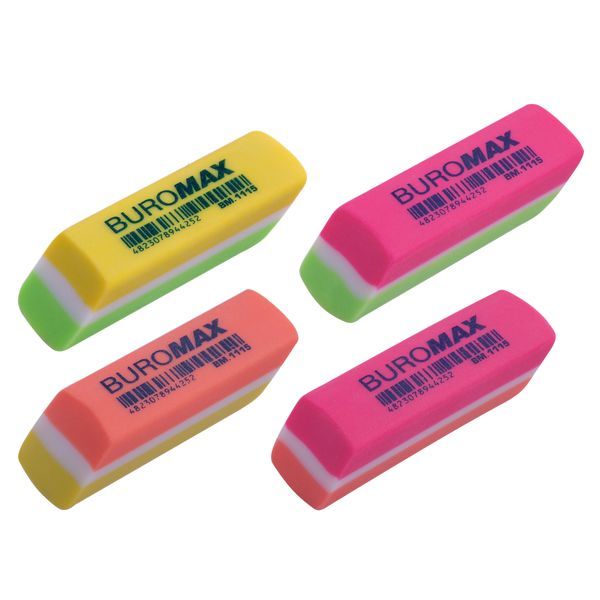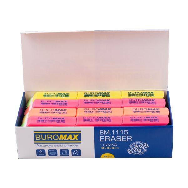 Основные характеристики: - ластик клиновидный; - материал: винил (PVC), супер-мягкие; - размер: 53x16x12 мм; - форма: прямоугольная; -стирают чернографитные карандаши 7Н – 5В с любых видов бумаги, не оставляя разводов и не повреждая поверхность; - формула «DUST – FREE» – чистое и аккуратное стирание. При стирании образуется минимальное количество частиц от ластика, которые сворачиваются в комок , а не рассыпаются по бумаге; - не содержат фталатов – безопасное использование; - не затвердевают на воздухе и под солнцем; - яркие неоновые комбинированные цвета; - упаковка: 36 шт в картонном дисплее (ассорти)