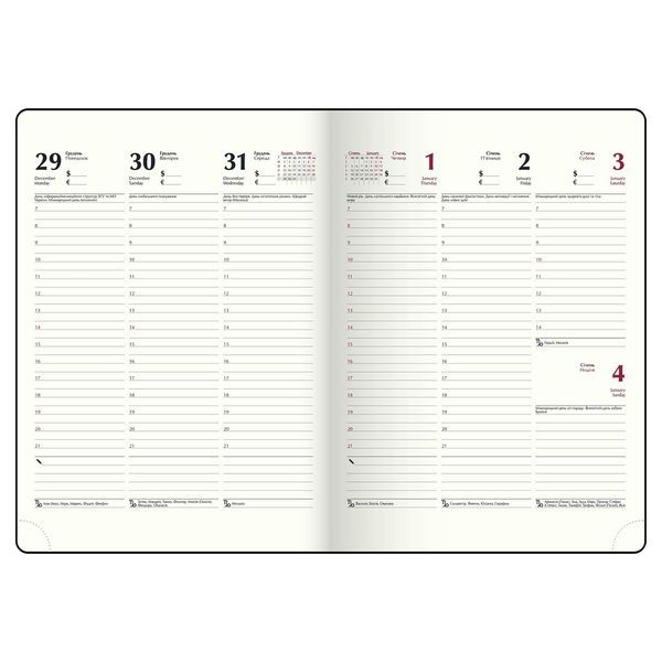 Жесткая обложка еженедельника BRAVO изготовлена из гладкой искусственной кожи, с поролоном. На лицевой стороне – тиснение года слепым методом. Тонировка среза золотом придает изысканный акцент. Классический и сдержанный дизайн станет отличным дополнением к корпоративному стилю компании. Большой формат позволяет не только планировать, но и делать содержательные заметки и записи. Формат А4 136 страниц Внутренний блок: офсетная бумага кремового цвета плотностью 70 г/м² Закладка-ляссе в цвет обложки Перфорированные уголки листов Печать блока в 2 цвета: серый и бордовый Два языка блока: украинский, английский Карты Украины и Европы на форзацах Индивидуальная упаковка: картонная коробка Структура внутреннего блока: Страница для внесения личной информации Календари на 2025 – 2028 годы Планинг на 2026 год Информационно-справочный блок: национальные, религиозные, профессиональные праздники и памятные даты, знаки зодиака, телефонные коды мобильных операторов и областных центров Украины, буквенные автомобильные коды стран, таблица расстояний между областными центрами Украины, справочник систем измерения, международные знаки соответствия, знаки ухода за одеждой На одной странице вертикально размещено три/четыре дня недели с организатором времени с 7:00 до 21:00, указанием месяца, года, дня недели и даты, календарь на текущий/следующий месяц, именинники, знаки зодиака, праздники и памятные даты Алфавитная книга для внесения контактов Еженедельник BUROMAX – незаменимый помощник в планировании Вашего рабочего времени! На этой модели еженедельника возможно тиснение как слепым методом, так и методом фольгирования.