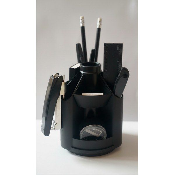 Набор настольный с наполнением на 14 предметов. Конструкция с вращающейся пластиковой подставкой (360⁰), имеющая 10 отделений. В набор входит: подставка, 2 ручки, 2 карандаша черногр., ножницы, степлер, скобы, чем канцелярский, линейка, точилка, ластик, скрепки, кнопки-гвоздики. Материал: пластиковый. Цвет: черный. Размер: 100х125мм.