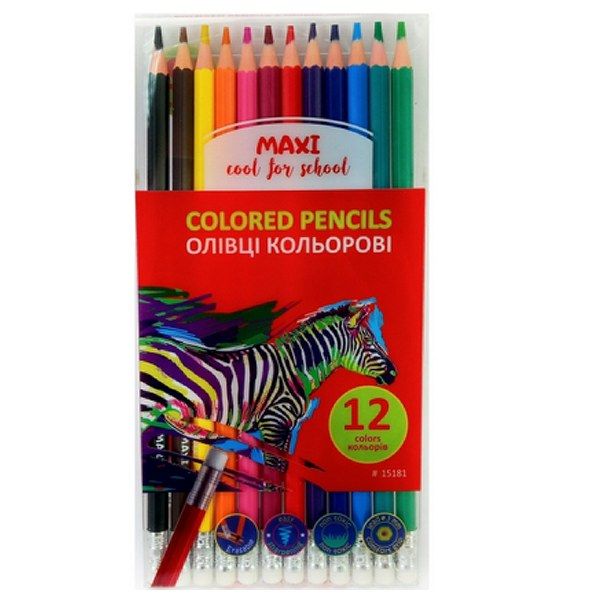 Карандаши цветные 12шт. Maxi пластиковые шестигранные стираються, с ластиком
