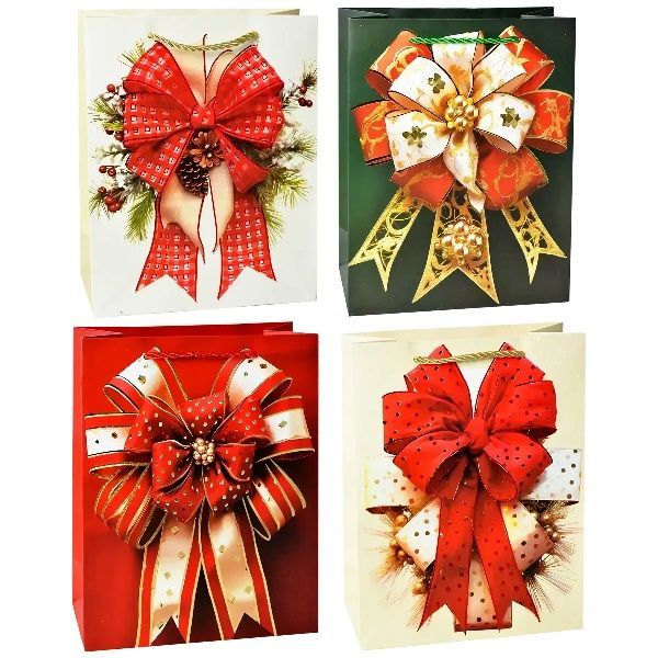 Пакет подарочный бумажный 18х23х10см. Плотность 210 г/м2. Ручки - шнурок. В одной упаковке 4 дизайна.